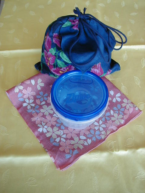 日本にはこの食事の持ち帰りという習慣がありませんが「とても美味しいのだけれど、もうお腹がいっぱいで食べられない」「無理してたくさん食べたら太っちゃう」など様々な理由で残してしまうことが殆どではないでしょうか? そんな時にお勧めなのが「マイ・お持ち帰りセット」です。小さなプラスチック容器をビニール袋に入れて、それをお手製の巾着袋や小風呂敷などに包んで持参すれば、食べきれないものをさりげなく持ち帰ることが出来ます。万一、食べ物から水分が出てしまう時に備え、プラスチック容器を更にビニール袋に入れておけば巾着袋や小風呂敷に汁がしみてしまう心配はありません。食事がテーブルに運ばれた途端に、心のなかで「これは生ものだからここで食べてしまいましょう」「ご飯や火の通った料理は持ち帰れそうだわ」と考えてから食べ始めます。