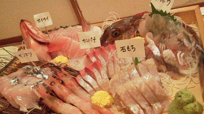 それから、驚いたのはオプションで頼んだ地魚のお刺身盛り合わせの新鮮なこと名前のわからない魚ばかりでしたが、お刺身に名前を書いてくれているというちょっとした心遣いもニクいですよね