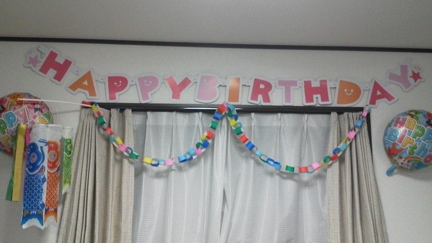 ハッピーバースデーのレターバナーとバルーン、それから折り紙で輪を作ってみました