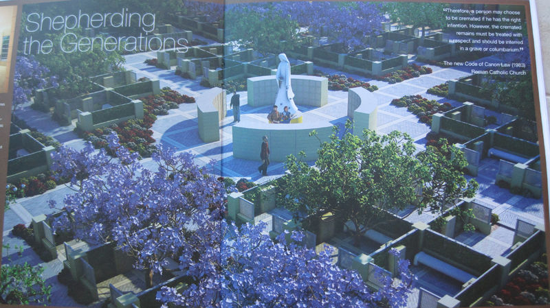 それは大きな公園のような場所に建てられる予定の大きな公園墓地です。カトリック系キリスト教なのにも関わらず、火葬にされた灰が入る小さな入れ物が壁にならび、中心にはマリア像があり、噴水があり、ベンチが備え付けられています。この公園墓地の予定地はネバダ州とカリフォルニア州の境辺りになるそうですが、ここに入る人を募って募金を集めている最中だそうです。