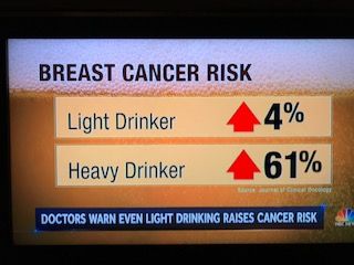 しかし、調査によれば、大腸がんのリスクは、Moderate(中程度)の飲酒で17%。Heavy(多量)の飲酒では44%もリスクが上がるそうです。また、女性にとって気になる情報としては、乳がんですが、Light(軽い)飲酒で4%。Heavy(多量)の飲酒では61%もリスクが上がるそうです。